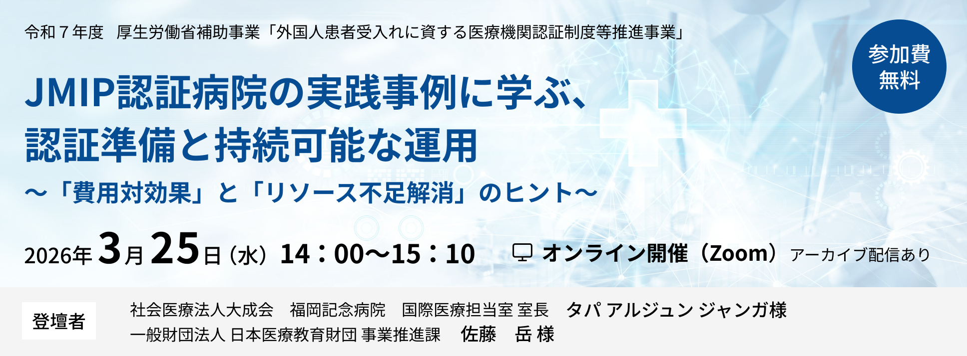 講演「無料・低額サービスのご紹介」 (7分) ・事務局(メディフォン株式会社) 講演「リスク対策のためのJMIP必須評価項目と認証の意義」 (10分) ・一般財団法人 日本医療教育財団 事業推進課 佐藤 岳様 講演「JMIP認証病院の実践事例に学ぶ、認証準備と持続可能な運用 ~「費用対効果」と「リソース不足解消」のヒント~」 (20分) ・社会医療法人大成会 福岡記念病院 国際医療担当室 室長 タパ アルジュン ジャンガ様 【ワークショップ】リアルタイム・アンケート(20分) 質疑応答・閉会挨拶(13分) |